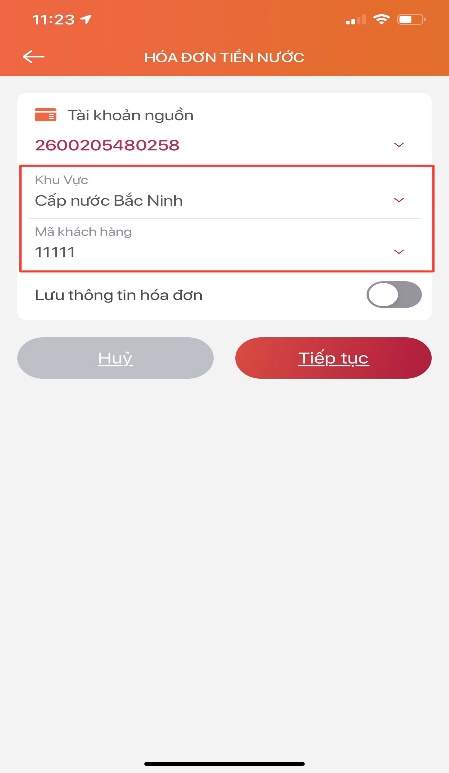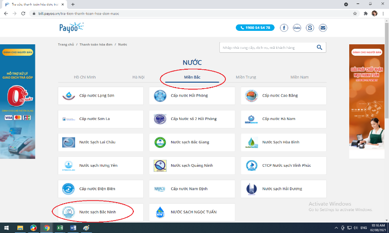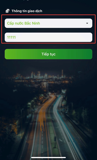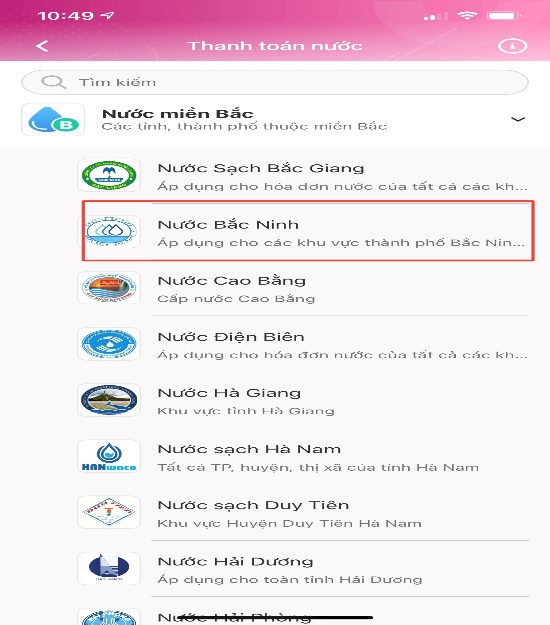 - Chọn khu vực “Cấp nước Bắc Ninh”