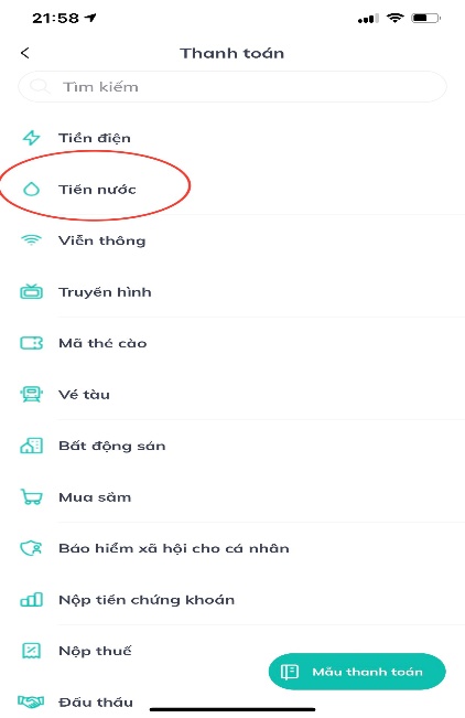 - Chọn “Tiền nước”