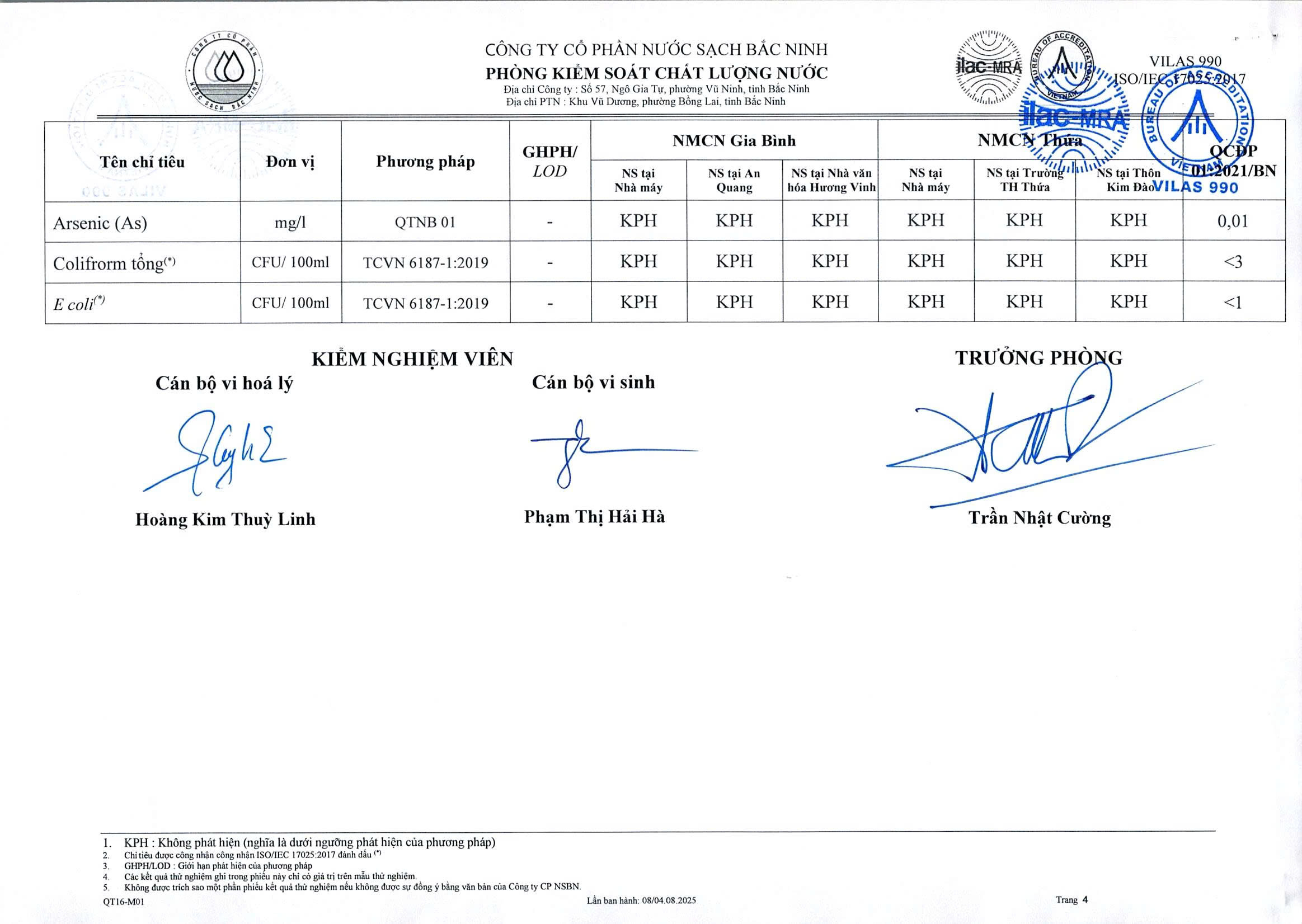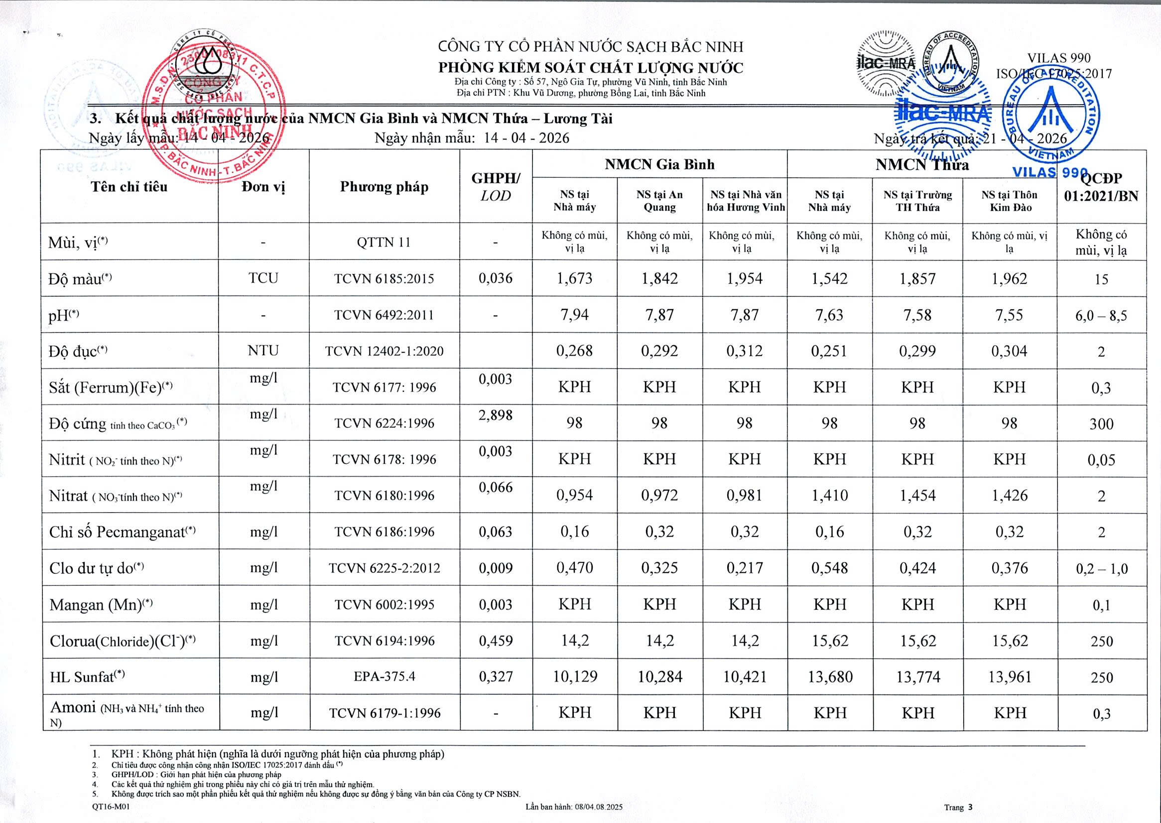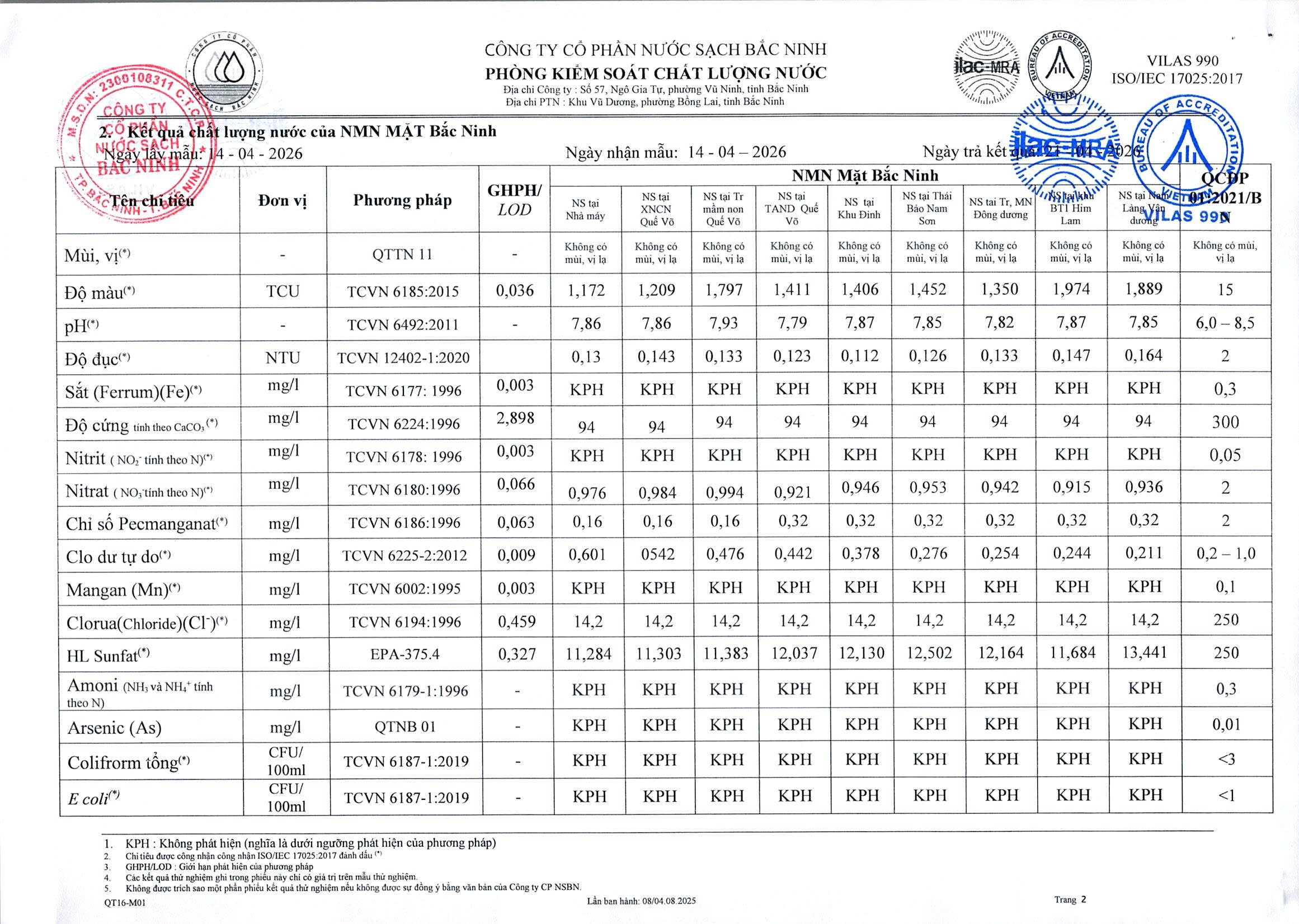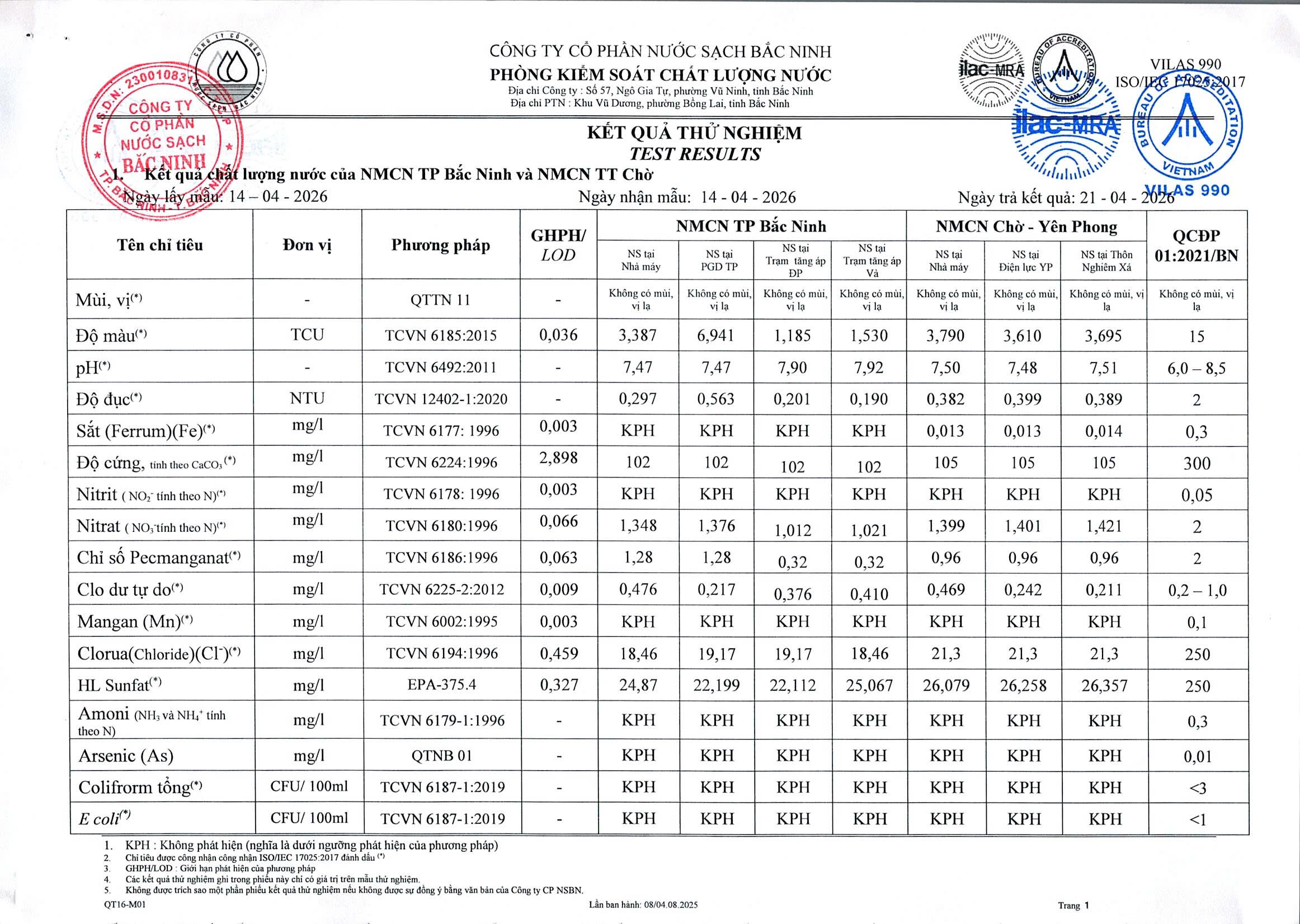 Chất lượng nước tháng 4 năm 2026 Đăng bởi Công ty cổ phần nước sạch Bắc Ninh vào lúc 24/04/2026 Chia sẻ: Tin liên quan Chất lượng nước tháng 4 năm 2026 Chất lượng nước tháng 3 năm 2026 Chất lượng nước tháng 2 năm 2026 Chất lượng nước tháng 1 năm 2026 Chất lượng nước tháng 12 năm 2025