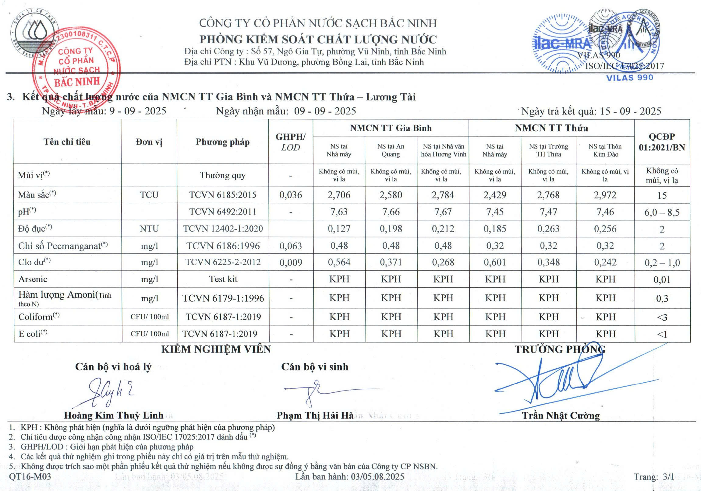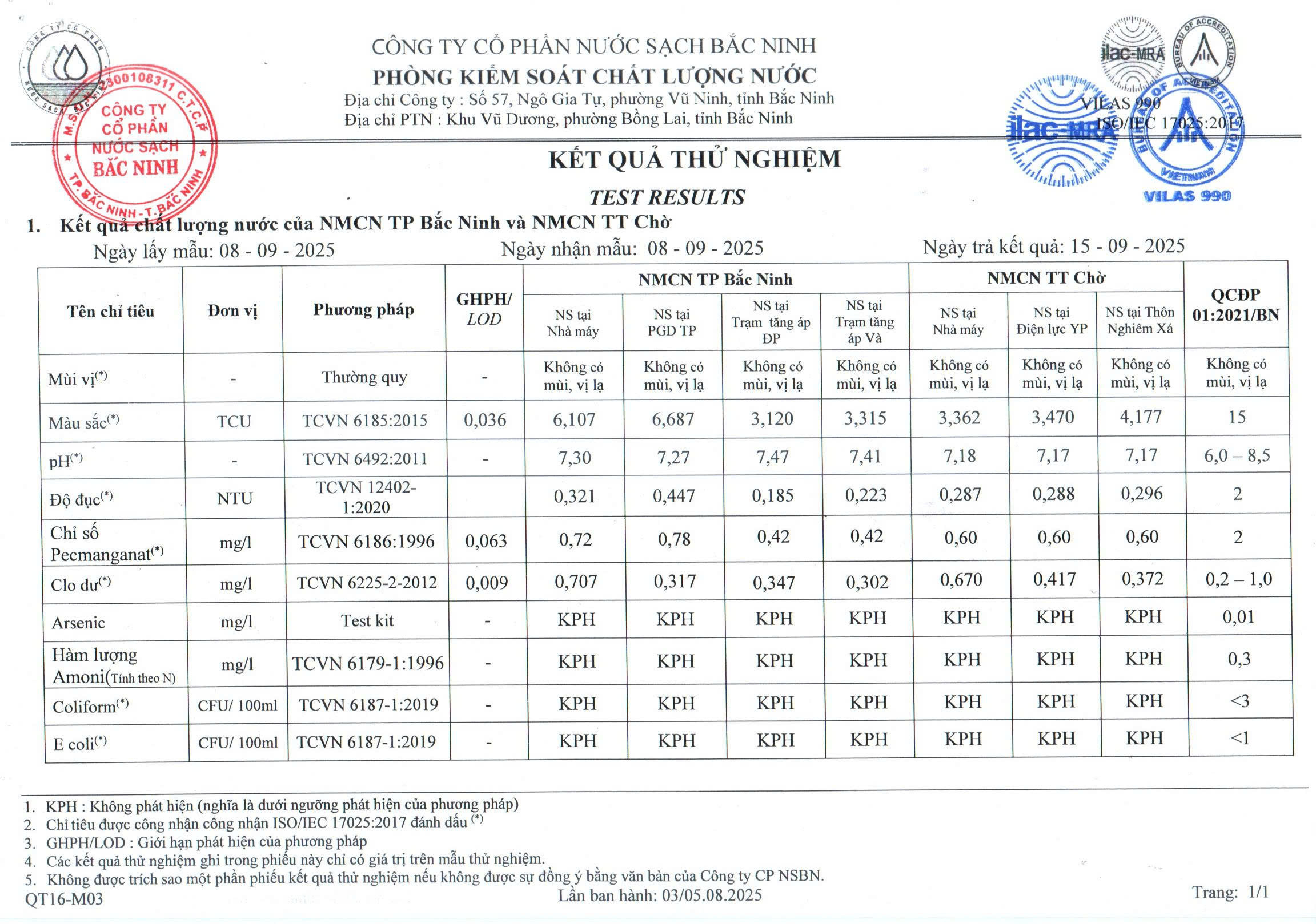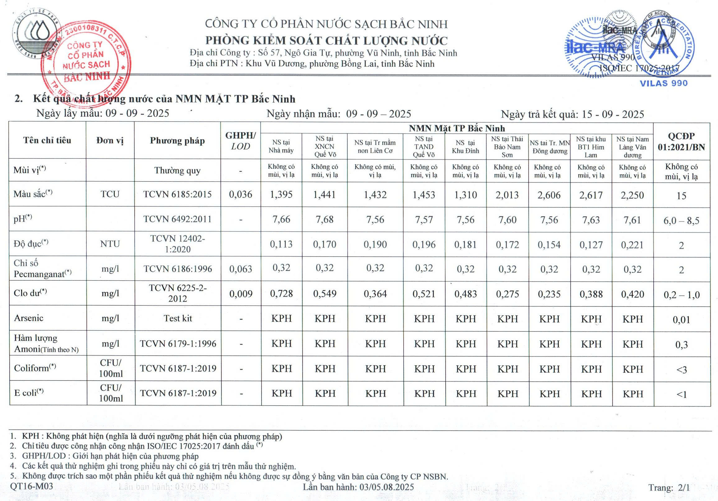 Chất lượng nước tháng 9 năm 2025 Đăng bởi Công ty cổ phần nước sạch Bắc Ninh vào lúc 19/09/2025 Chia sẻ: Tin liên quan Chất lượng nước tháng 9 năm 2025 Chất lượng nước tháng 8 năm 2025 Chất lượng nước tháng 7 năm 2025 Chất lượng nước tháng 6 năm 2025 Chất lượng nước tháng 5 năm 2025
