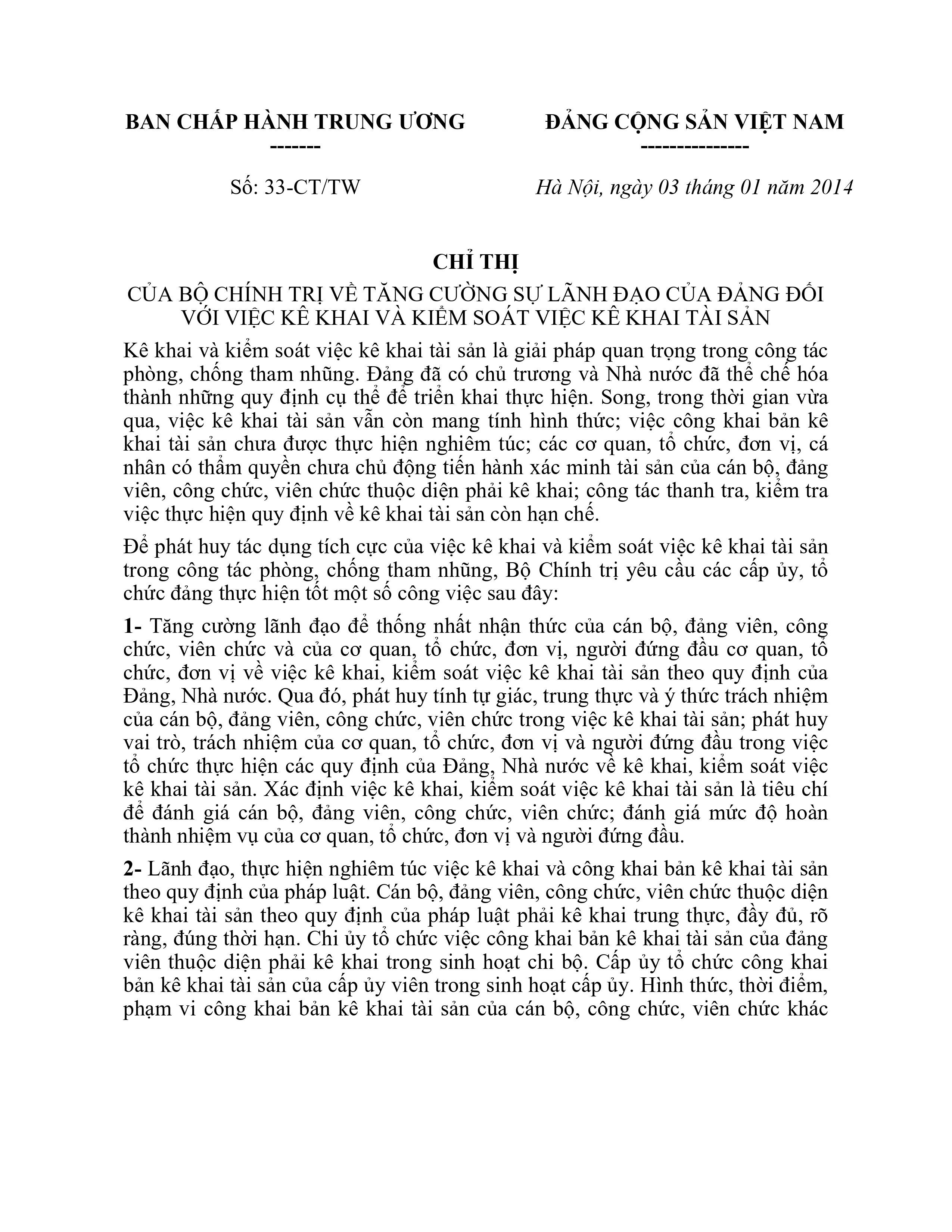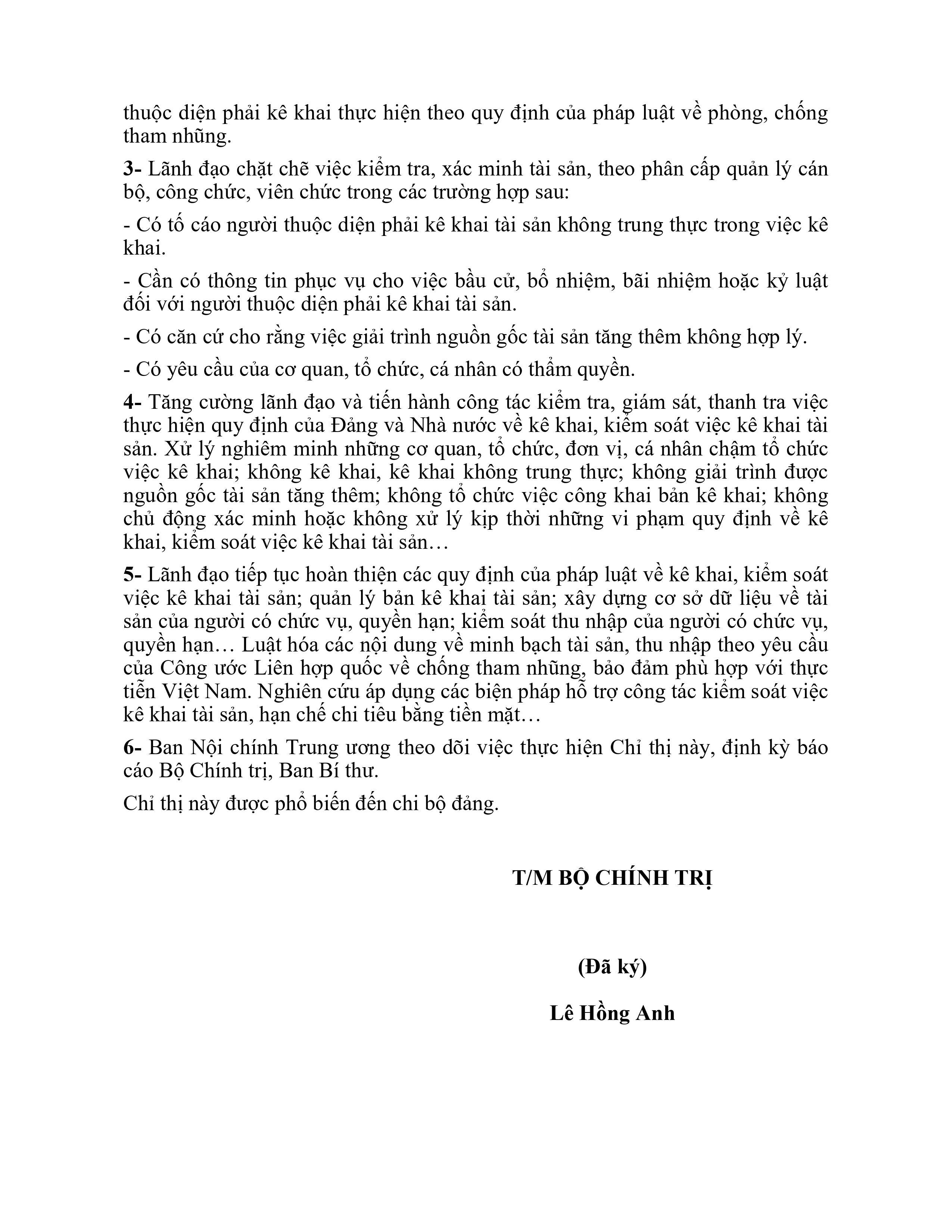 Chỉ thị củ Bộ chính trị về tăng cường sự Lãnh đạo của Đảng đối với việc kê khai và kiểm soát việc kê khai tài sản