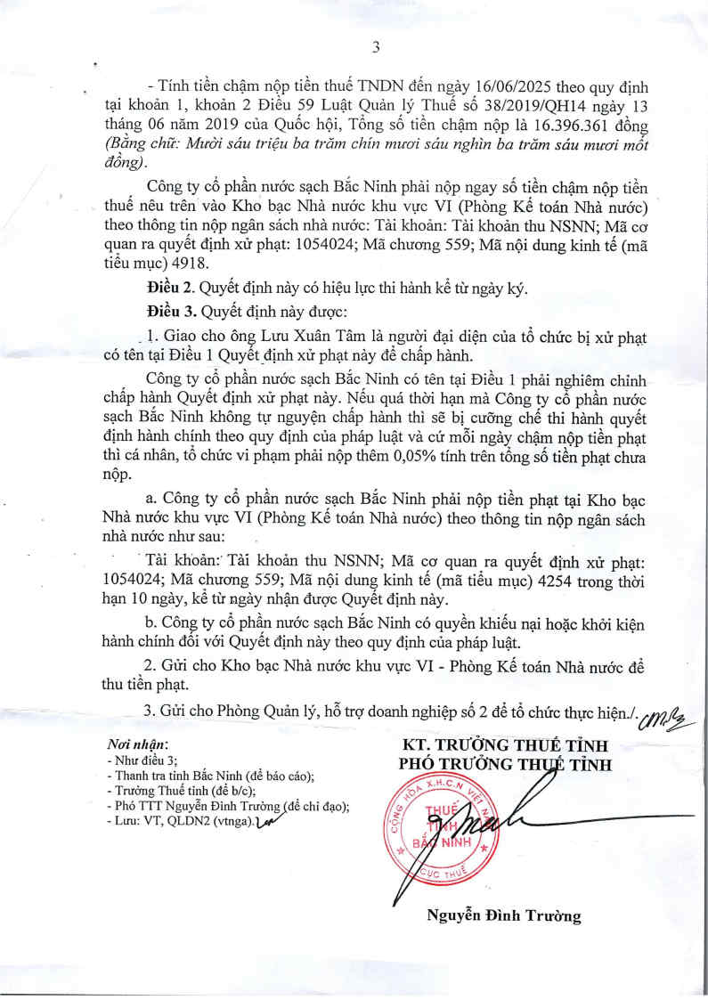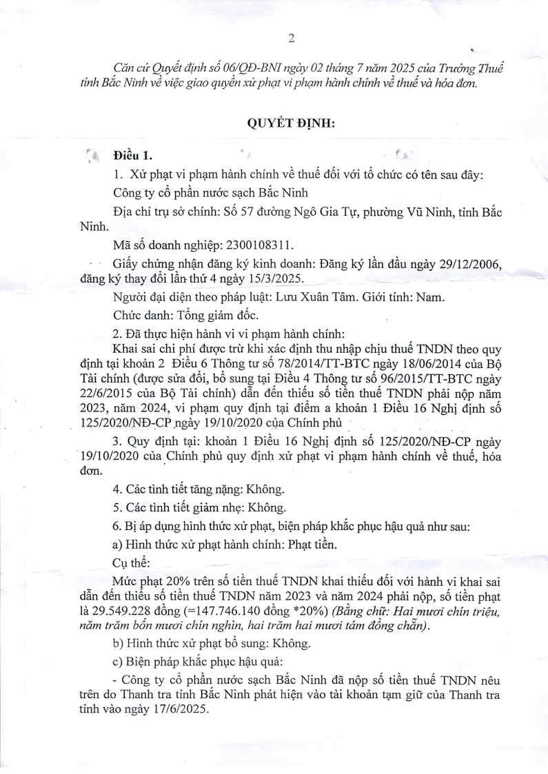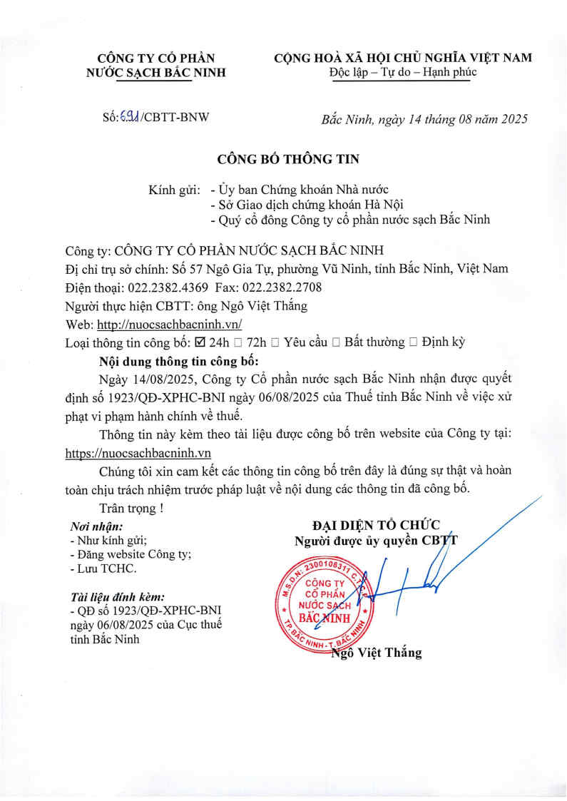 Công bố Quyết định xử phạt hành chính về thuế Đăng bởi Công ty cổ phần nước sạch Bắc Ninh vào lúc 14/08/2025 Chia sẻ: Tin liên quan Thông báo thay đổi nhân sự Công bố Quyết định xử phạt hành chính Công bố Quyết định xử phạt hành chính về thuế Thông tin về quản trị Công ty 6 tháng đầu năm 2025 Thông báo mất giấy chứng nhận cổ phần