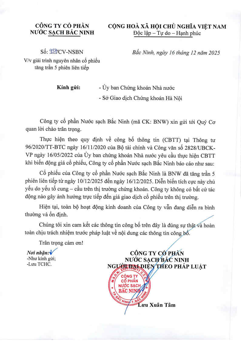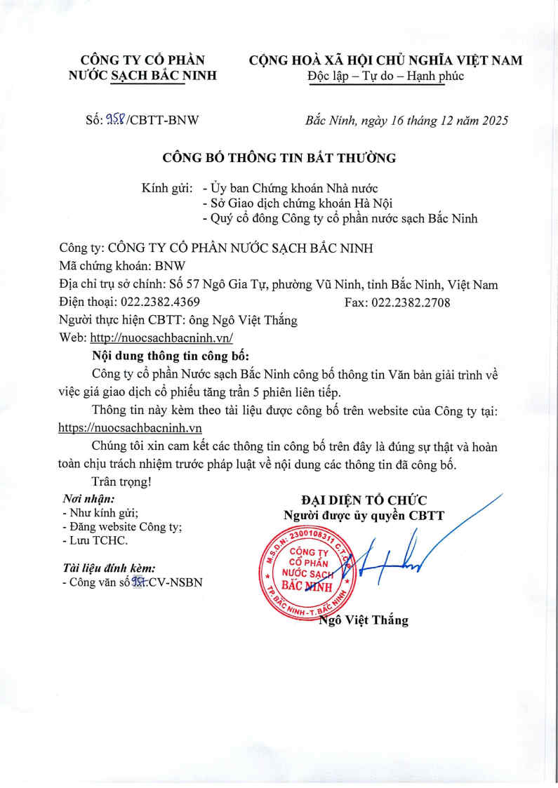 Công văn giải trình nguyên nhân cổ phiếu tăng trần 5 phiên liên tiếp Đăng bởi Công ty cổ phần nước sạch Bắc Ninh vào lúc 16/12/2025 Chia sẻ: Tin liên quan Nghị quyết HĐQT kỳ 26 Công văn giải trình nguyên nhân cổ phiếu tăng trần 5 phiên liên tiếp Thông báo thay đổi nhân sự Công bố Quyết định xử phạt hành chính Công bố Quyết định xử phạt hành chính về thuế