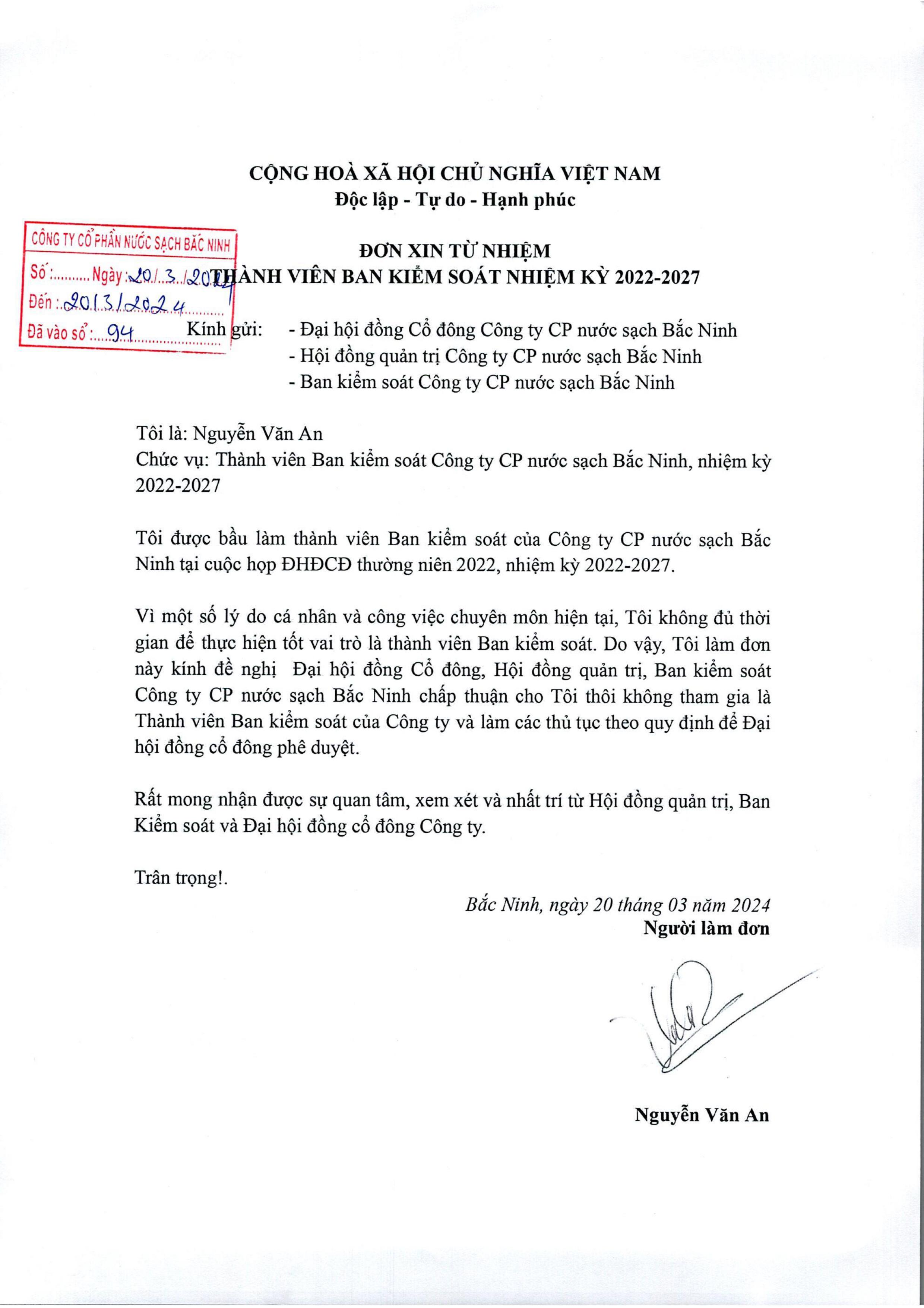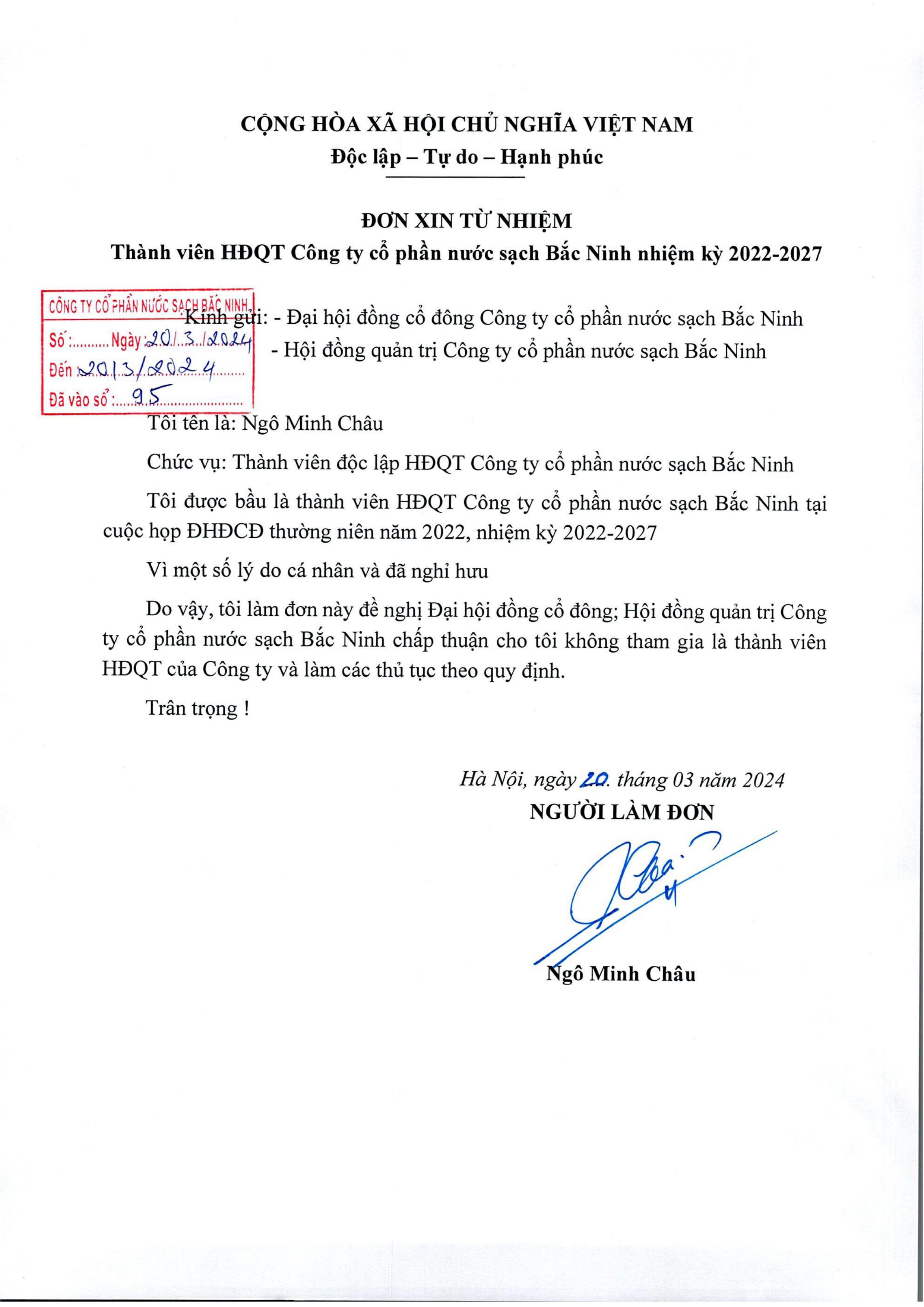 Đơn từ nhiện thành viên HĐQT của ông Nguyễn Minh Châu và đơn từ nhiệm thành viên BKS của ông Nguyễn Văn An