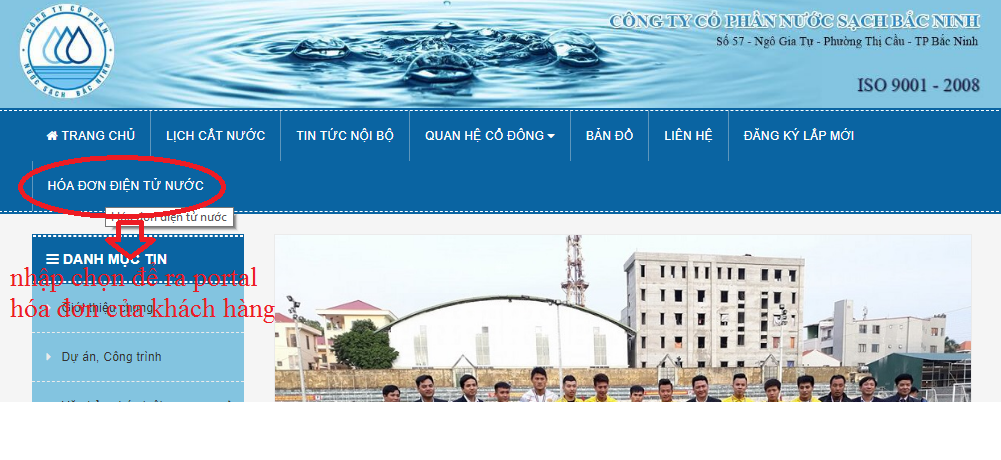 Bước 1: Khách hàng truy cập vào site: http://nuocsachbacninh.vn/, sau đó kích chọn “HÓA ĐƠN ĐIỆN TỬ NƯỚC”.
