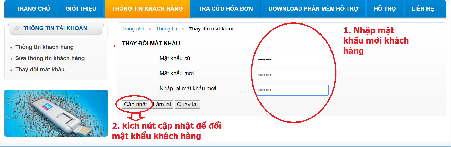 Bước 3: Kích chọn “Thông tin khách hàng” để ra trang có chức năng đổi mật khẩu khách hàng