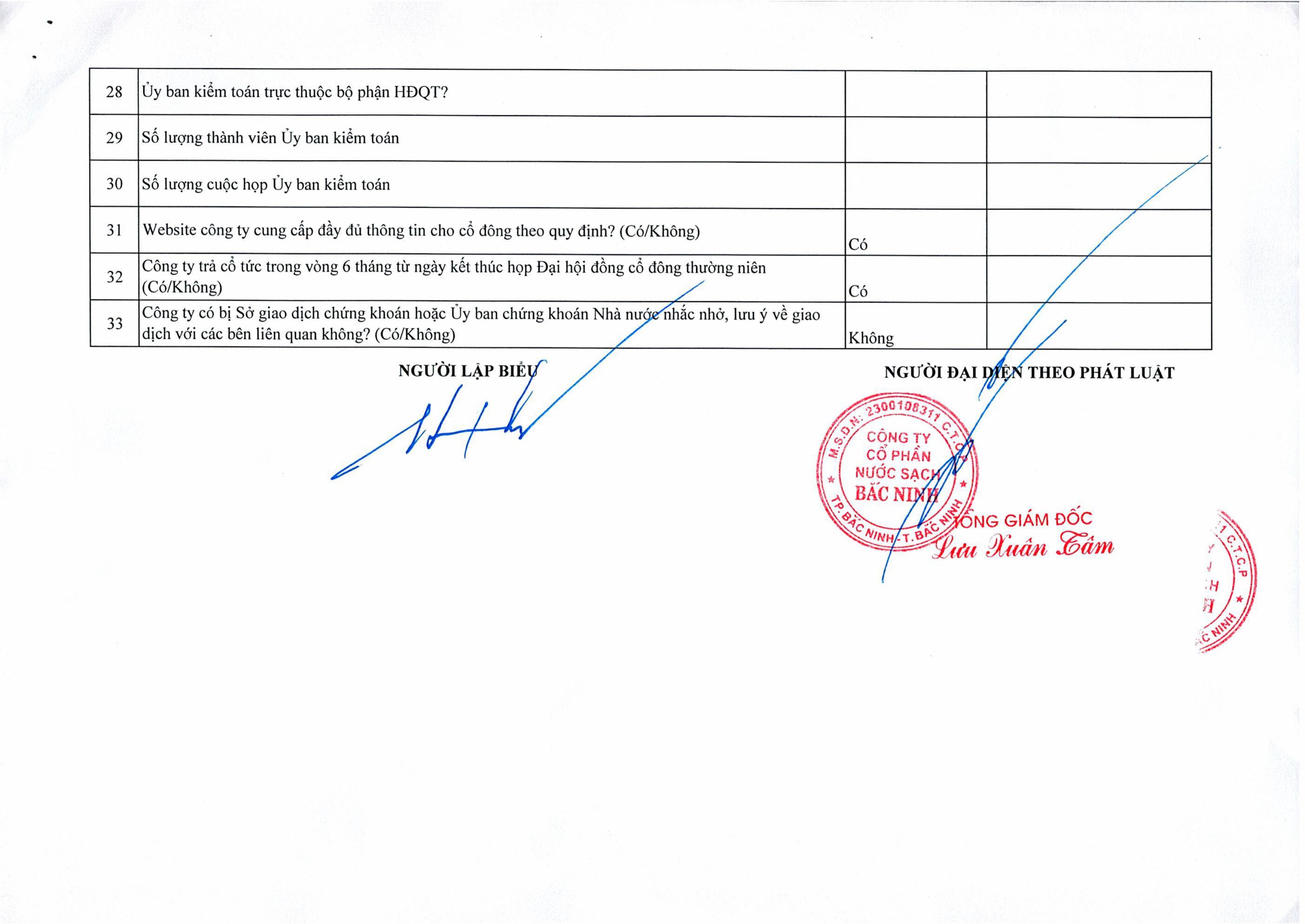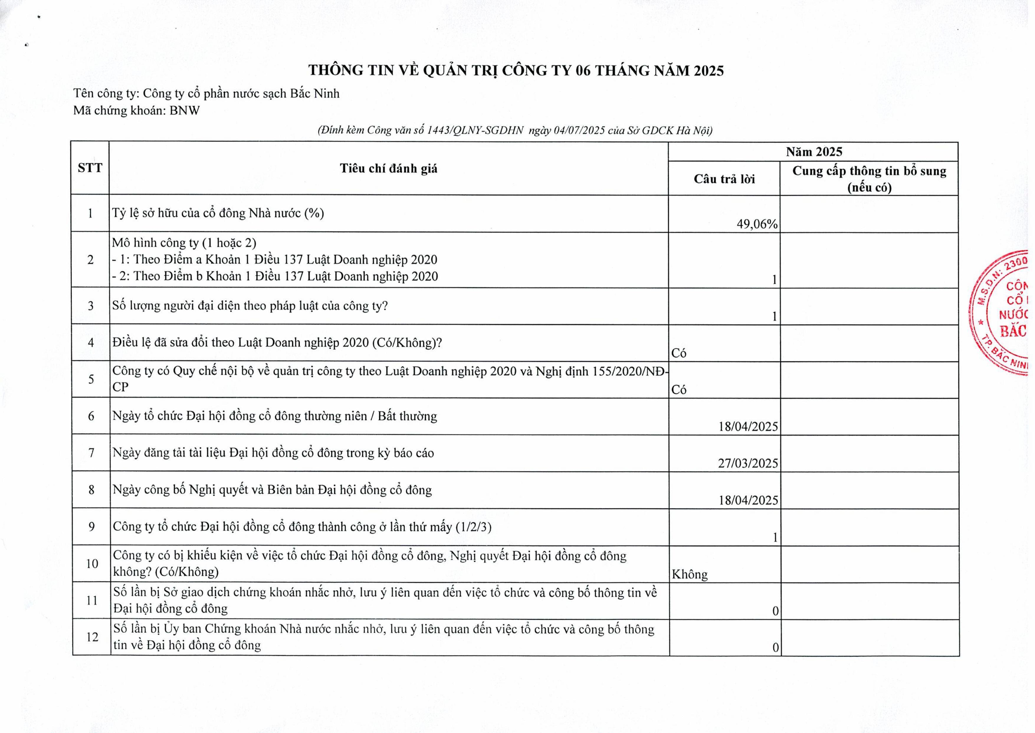 Thông tin về quản trị Công ty 6 tháng đầu năm 2025 Đăng bởi Công ty cổ phần nước sạch Bắc Ninh vào lúc 23/07/2025 Chia sẻ: Tin liên quan Thông báo thay đổi nhân sự Công bố Quyết định xử phạt hành chính Công bố Quyết định xử phạt hành chính về thuế Thông tin về quản trị Công ty 6 tháng đầu năm 2025 Thông báo mất giấy chứng nhận cổ phần