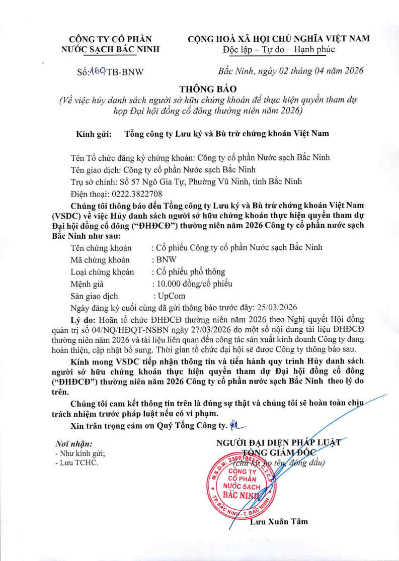 Thông báo hủy danh sách người sở hữu chứng khoán để thực hiện quyền tham dự ĐHĐCĐ thường niên năm 2026