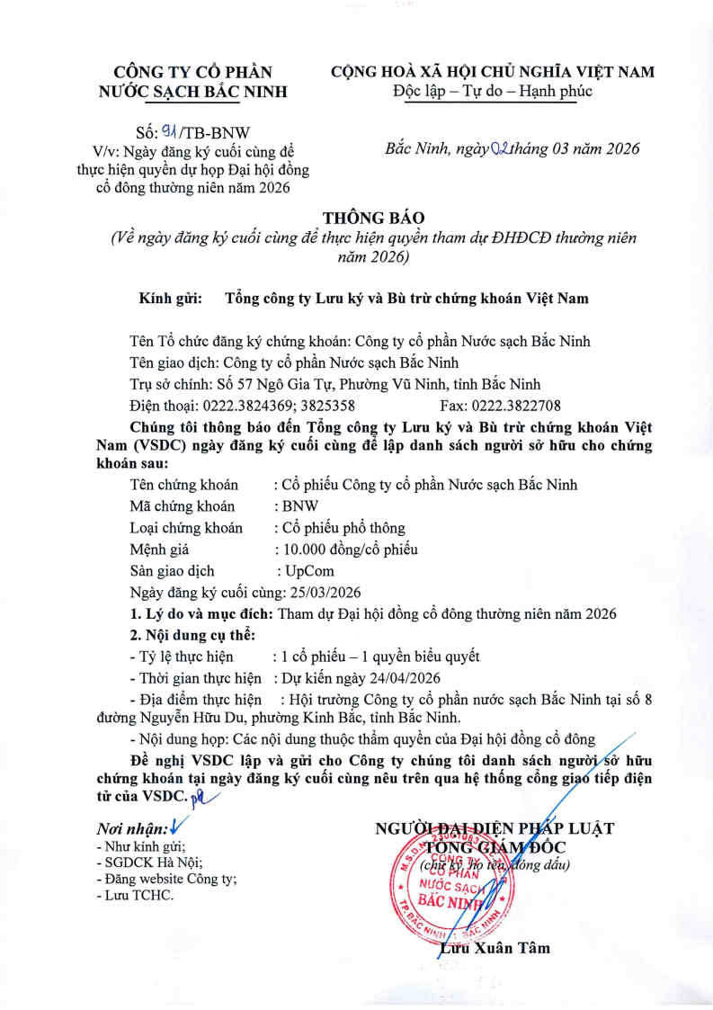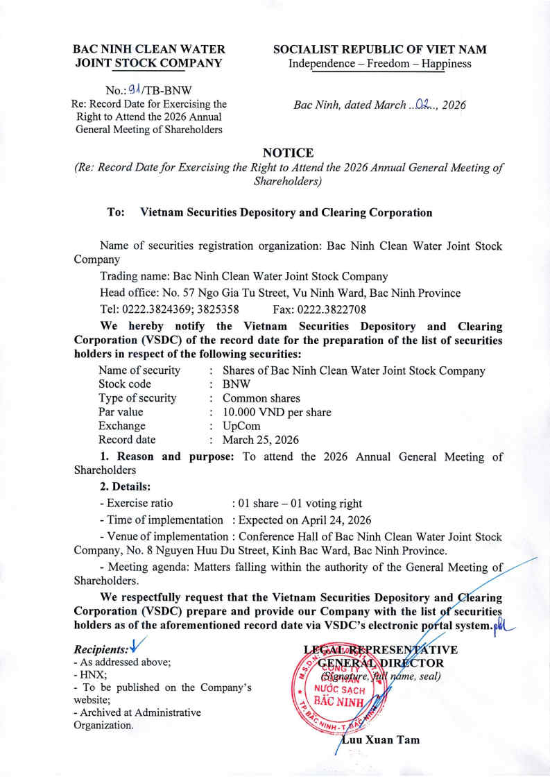 Thông báo ngày đăng ký cuối cùng để thực hiện quyền tham dự ĐHĐCĐ thường niên năm 2026 Đăng bởi Công ty cổ phần nước sạch Bắc Ninh vào lúc 02/03/2026 Chia sẻ: Tin liên quan Thông báo ngày đăng ký cuối cùng để thực hiện quyền tham dự ĐHĐCĐ thường niên năm 2026 Nghị quyết HĐQT kỳ 26 Công văn giải trình nguyên nhân cổ phiếu tăng trần 5 phiên liên tiếp Thông báo thay đổi nhân sự Công bố Quyết định xử phạt hành chính