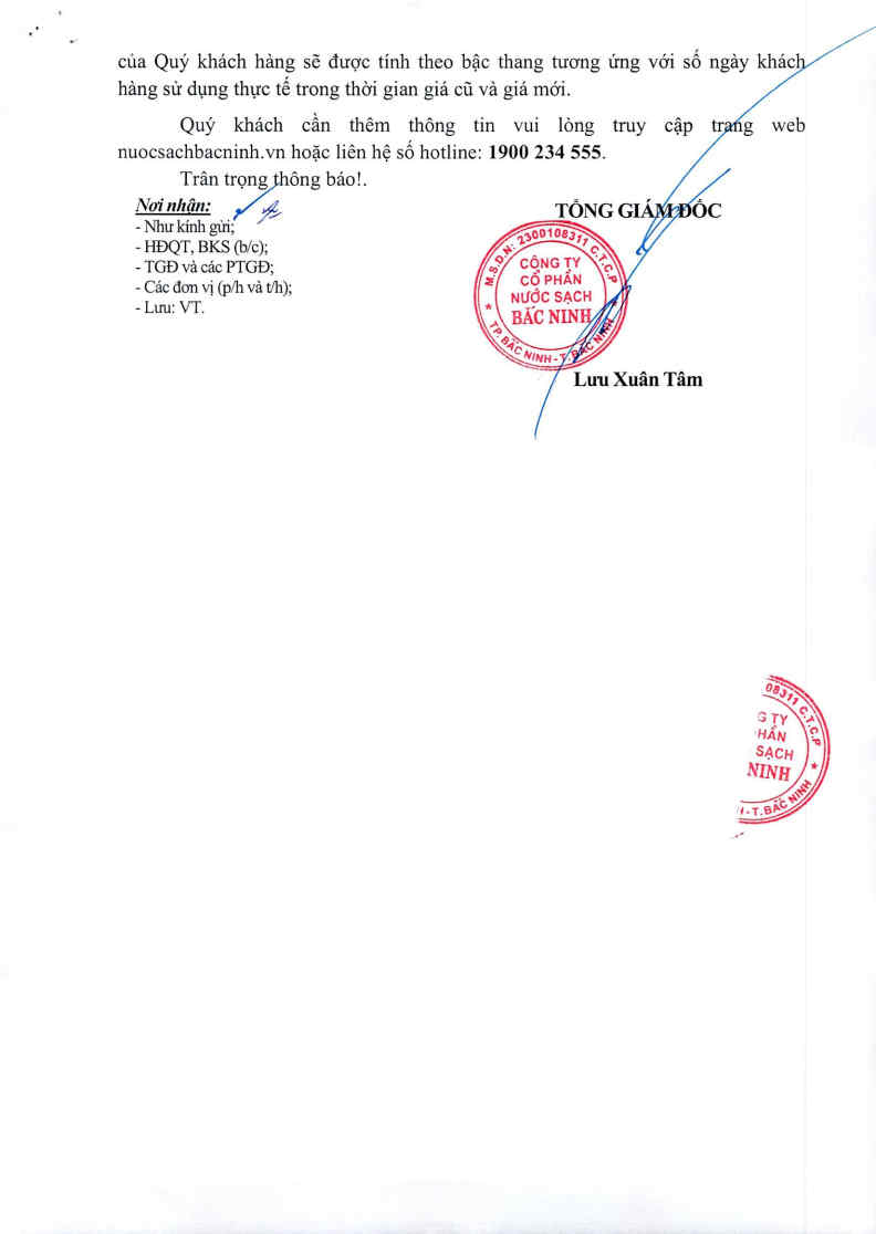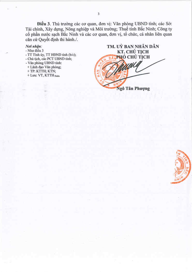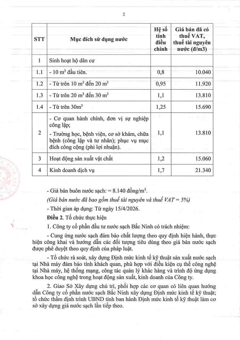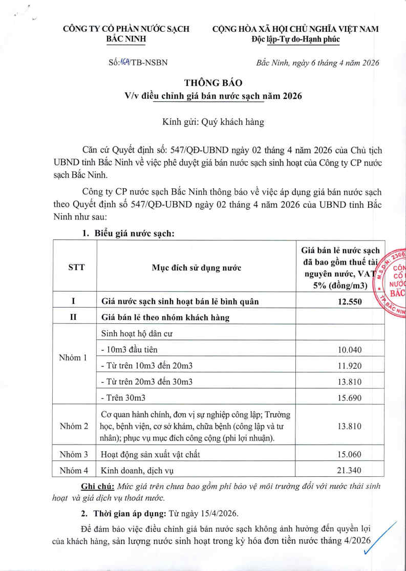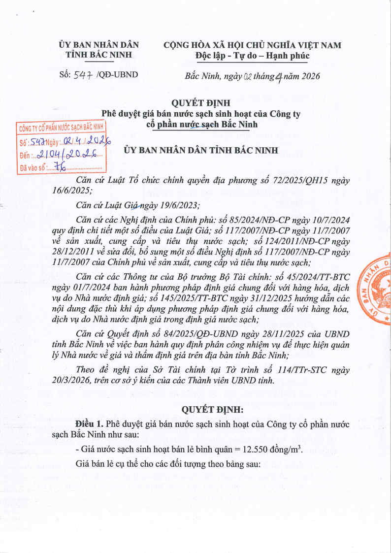 Căn cứ Quyết định số: 547/QĐ-ubnd ngày 02 tháng 04 năm 2026 của Chủ tịch UBND tỉnh Bắc Ninh về việc phê duyệt giá bán nước sạch sinh hoạt của Công ty CP nước sạch Bắc Ninh.